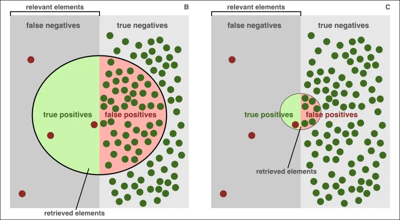 Attempting to fine-tune the rule by applying more filters to narrow down results might lead to scenario C (right). While Precision improves slightly (~10%), alert fatigue is alleviated with 86% fewer detections. However, Recall is reduced (already low), increasing the risk of being compromised without detection -—a less stressful yet dangerous scenario. The calculations are as follows: